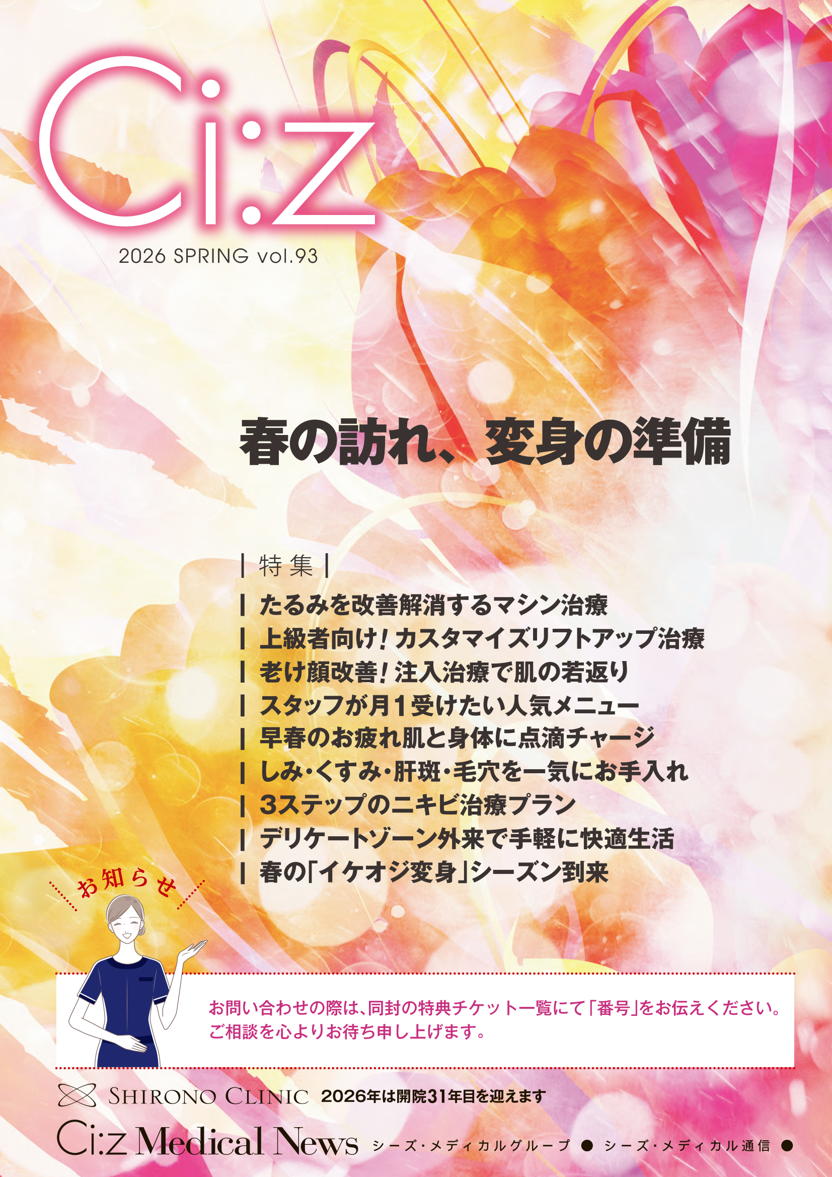 シロノクリニックでは、年に数回、会報誌「シーズ・メディカル通信」をお送りしています。最新の美容医療情報や特別キャンペーンチケット、ご友人様へのご優待チケットなど、嬉しい特典を満載にお届けしています。