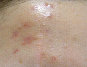 黄色にきびは膿疱性(のうほうせい)にきびともいいます。化膿がひどく、膿疱が数多くみられ、赤みがとても強くなっています。赤みが強いのですが、膿が黄色いため、黄色にきびと呼ばれています。主にあご、頬、髪の毛の生え際にでやすいのが特徴です。