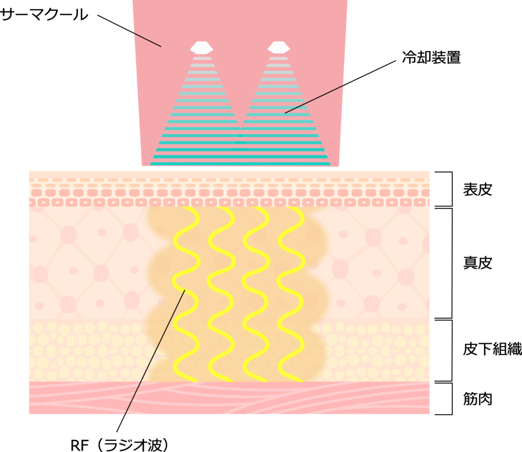 サーマクールは、皮膚表面を冷却しながらRF波(高周波:6.78MHz)という熱エネルギーを与えることで、